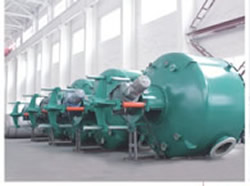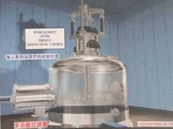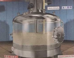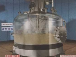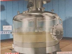 圖①:反應(yīng)釜中的混懸液靠自身的重力或經(jīng)泵注入到過(guò)濾器中,然后在濾液接收裝置中抽真空,濾液接收裝置連接在濾液流出口上。 圖②:濾液通過(guò)濾床被抽濾至接收裝置,濾餅逐漸在濾床上形成。 圖③:當(dāng)大多數(shù)濾液抽出后,濾床上沉積的濾餅可能還含有5%-20%的溶劑,具體情況與混懸液中固體的性質(zhì)有關(guān)。 圖④:首次過(guò)濾完成后,如果需要,可噴淋洗滌液,啟動(dòng)攪拌器反向攪拌,使濾餅重新混懸。 圖⑤:通過(guò)操作攪拌器,還可以輕輕地?cái)D壓濾餅,擠出殘余液體。 圖⑥:為了盡可能多地脫除濾餅中的殘留液體或溶劑,過(guò)濾器可加上夾套,在其中通蒸汽或熱水加熱干燥。在過(guò)濾器的頂部和底部同時(shí)抽真空,殘留溶劑揮發(fā),通過(guò)接收裝置上的冷凝器濃縮并回收。對(duì)有些物料,執(zhí)行上述流程即可,毋須另配干燥器進(jìn)行干燥。 圖⑦:最后,經(jīng)過(guò)攪拌器在卸料方向的旋轉(zhuǎn)和同時(shí)的下降運(yùn)動(dòng),攪拌器刮鏟一層一層地順序?qū)V餅刮出,濾餅可從卸料口自動(dòng)出料。 圖⑧:攪拌器的攪拌漿和刮鏟示意。 紐克多功能過(guò)濾器系統(tǒng)具備如下優(yōu)點(diǎn): 1、系統(tǒng)封閉:此設(shè)備是一個(gè)全封閉運(yùn)行的系統(tǒng),能完全避免生產(chǎn)過(guò)程中溶劑對(duì)空氣的污染,同時(shí)能減少因與毒性物接觸而導(dǎo)致操作人員中毒事故的發(fā)生。 2、回收完全:物料和溶劑近乎完全回收,避免因物料遺漏和溶劑揮發(fā)而引起的浪費(fèi),具有很大的經(jīng)濟(jì)效益,特別是處理物料和使用溶劑價(jià)值較高時(shí)更是如此。 3、同時(shí)干燥:過(guò)濾、清洗和干燥能在同一設(shè)備中完成。容器壁可以配備加熱套層,從而能夠進(jìn)行干燥的操作。 4、操作連續(xù):能夠使過(guò)濾和干燥在一個(gè)連續(xù)的系統(tǒng)內(nèi)進(jìn)行,毋須處理濕濾餅。在過(guò)濾器下可以連接一個(gè)干燥器,使?jié)駷V餅直接卸入干燥器,干燥后的產(chǎn)品可以機(jī)械傳送至稱(chēng)量、包裝等工段。 5、節(jié)約人力:一個(gè)經(jīng)過(guò)簡(jiǎn)單培訓(xùn)的非技術(shù)人員即可以完成操作。開(kāi)、關(guān)、自動(dòng)進(jìn)料、自動(dòng)出料都毋須技術(shù)人員監(jiān)控。 6、清洗徹底:由于此設(shè)備具有自動(dòng)噴淋和重新打漿的功能,濾餅可以得到非常徹底的清洗。并且洗滌液用量較其它類(lèi)型設(shè)備少,可減少排污量和降低廢水處理費(fèi)用。 7、清洗生產(chǎn):此多功能過(guò)濾器干燥系統(tǒng)裝配有粉塵捕集器,能完全收集干燥后產(chǎn)生的粉塵,可滿(mǎn)足高潔凈度的生產(chǎn)操作要求。 | |